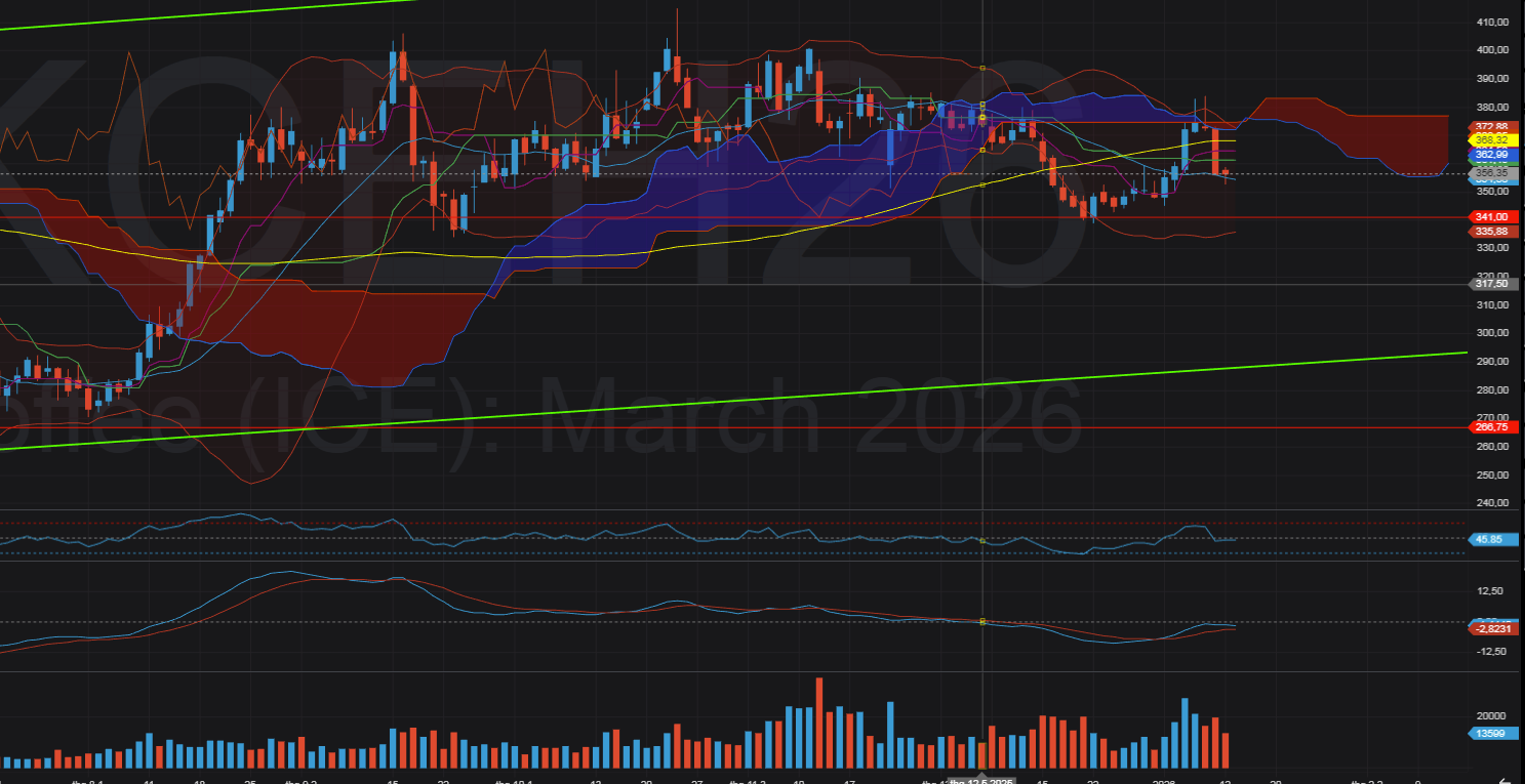 - 380 – 385 cent/lb: kháng cự mạnh (mây Ichimoku + MA)