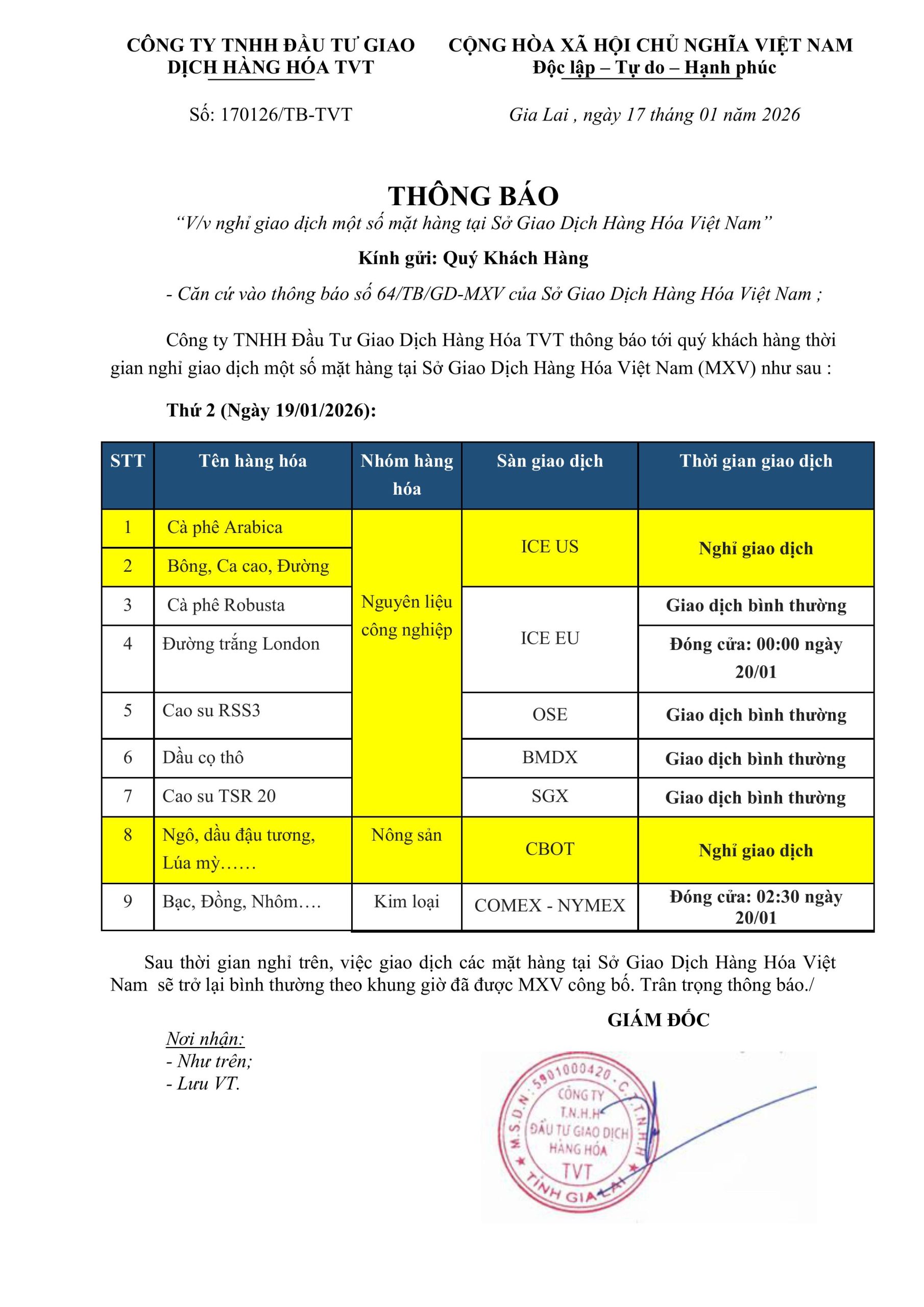 Thông báo nghỉ giao dịch một số mặt hàng ngày 19/01/2026 Kính gửi : Quý Khách Hàng Đầu tư TVT kính gửi quý khách hàng thông báo lịch nghỉ giao dịch một số mặt hàng Thứ 2 ngày 19/01/2026. Trân trọng! TVT-favicon Đầu tư TVT Thứ Bảy, 17/01/2026 Zalo icon share Copy link Kính gửi : Quý Khách Hàng Đầu tư TVT kính gửi quý khách hàng thông báo lịch nghỉ giao dịch một số mặt hàng Thứ 2 ngày 19/01/2026. Trân trọng!