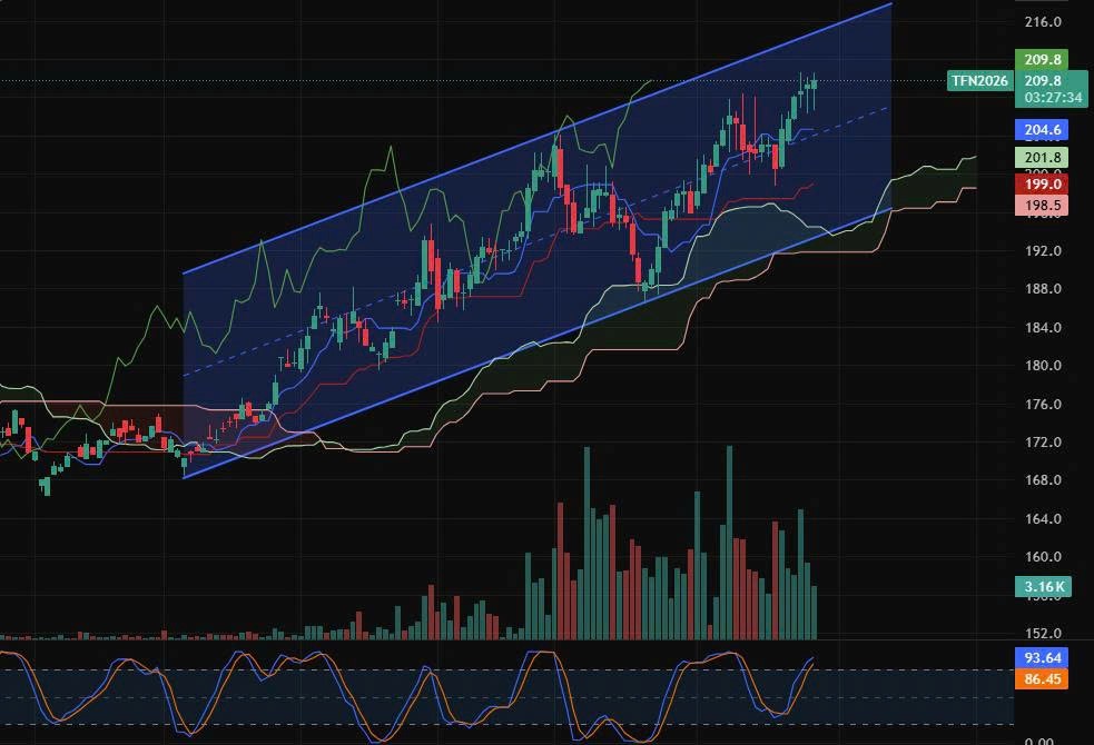 · Giá đang: test vùng đỉnh kênh (~210–212)