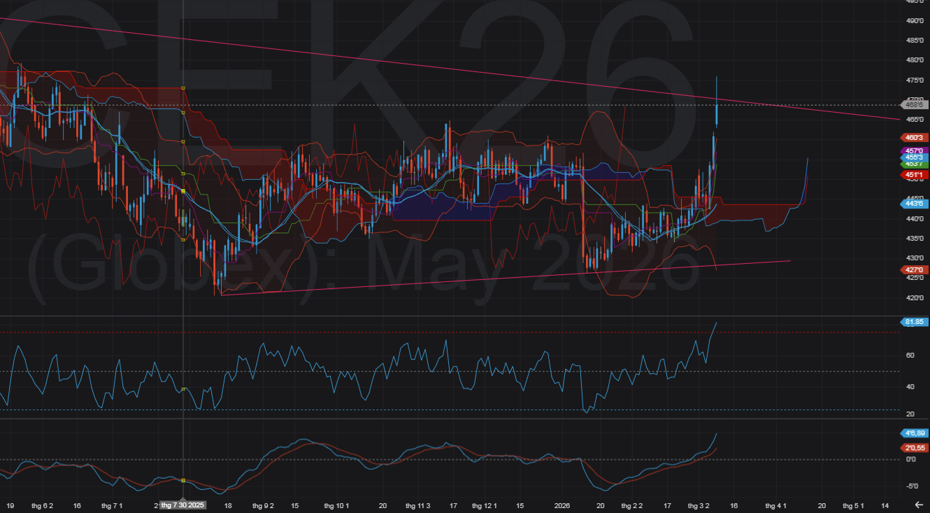 - Thị trường đang: break khỏi vùng tích lũy 440–450 và test trendline giảm dài hạn.