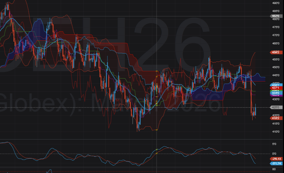 - Giá đã rơi mạnh về vùng đáy cũ ~418–422